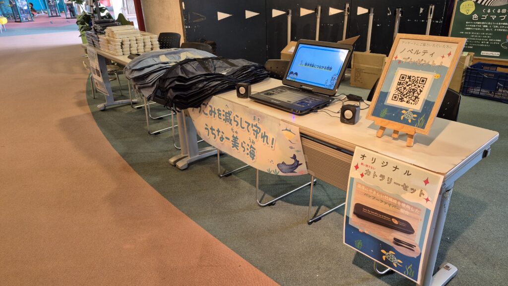 普及動画の放映と、アンケート(ノベルティ配布)、海洋プラゴミ釣りゲームを行いました!